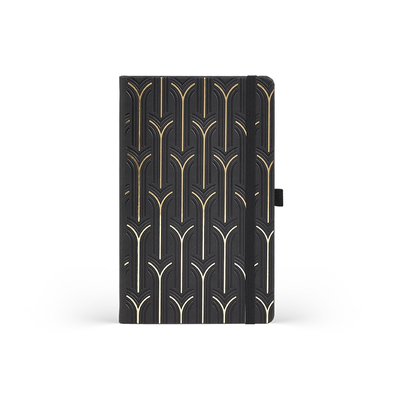 WYKOŃCZENIE: zakładka w kolorze czarnym, zaokrąglone narożniki bloku i oprawy, złote ranty bloku, gumka zamykająca i penloop w kolorze czarnym