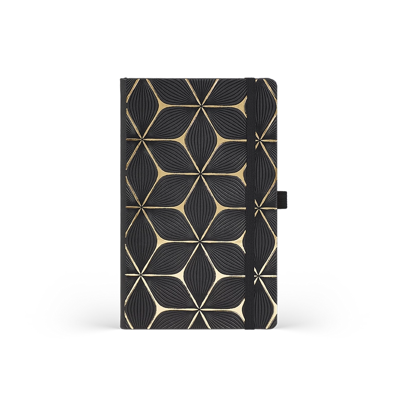 WYKOŃCZENIE: zakładka w kolorze czarnym, zaokrąglone narożniki bloku i oprawy, złote ranty bloku, gumka zamykająca i penloop w kolorze czarnym