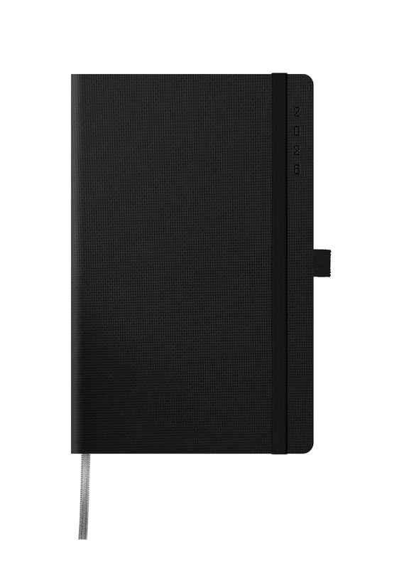 WYKOŃCZENIE: zakładka w kolorze czarnym, zaokrąglone narożniki bloku i oprawy, ranty pokryte metalizowaną folią, gumka zamykająca i szlufka na długopis w kolorze czarnym.