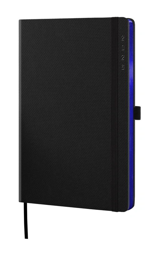 WYKOŃCZENIE: zakładka w kolorze czarnym, zaokrąglone narożniki bloku i oprawy, ranty pokryte metalizowaną folią, gumka zamykająca i szlufka na długopis w kolorze czarnym.