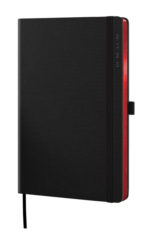 WYKOŃCZENIE: zakładka w kolorze czarnym, zaokrąglone narożniki bloku i oprawy, ranty pokryte metalizowaną folią, gumka zamykająca i szlufka na długopis w kolorze czarnym.