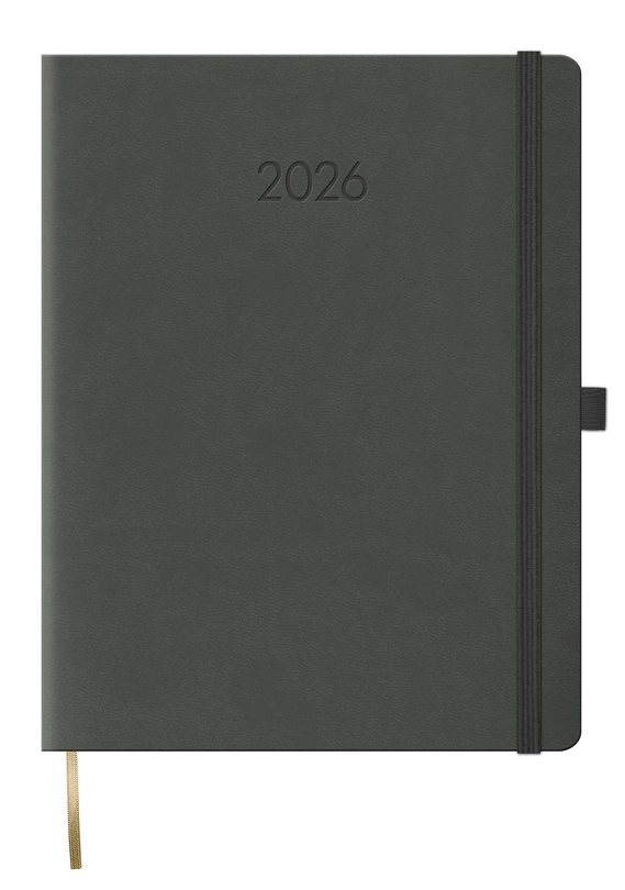 FORMAT: 190 x 250 mm (docięty blok książkowy) ILOŚĆ STRON: 160 stron/ lewa strona: tydzień, prawa strona: notes + 27 str. notatnik na końcu kalendarza KALENDARIUM: PL-GB-D-UA + imieniny i święta DRUK: 1-kolorowy, szary PAPIER: 80 g/m2, bezchlorowy, chamois, certyfikowany FSC WYKOŃCZENIE: oprawa szyta, zakładka w kolorze beżowym, zaokrąglone narożniki bloku i oprawy
