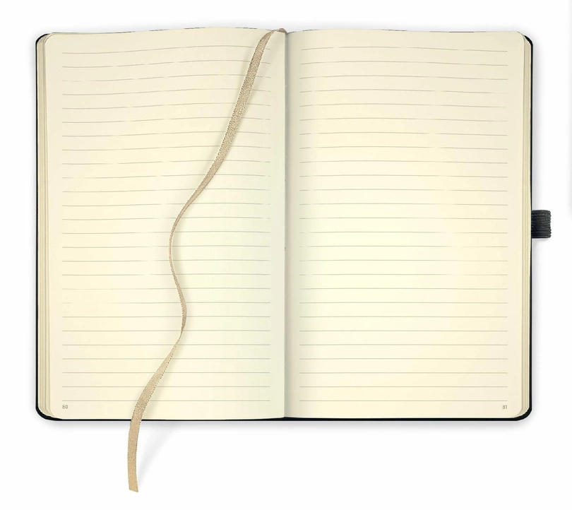 FORMAT: 130 x 210 mm (docięty blok książkowy) ILOŚĆ STRON: 192 ZADRUK BLOKU: linia DRUK: 1-kolorowy, szary PAPIER: 90 g/m2, bezchlorowy, chamois, certyfikowany FSC WYKOŃCZENIE: miedziane ranty bloku, czarne wyklejki, czarna kieszonka na dokumenty na tylnej wyklejce, satynowa zakładka w kolorze szarym; papierowa banderola z logo; pakowanie w polybag