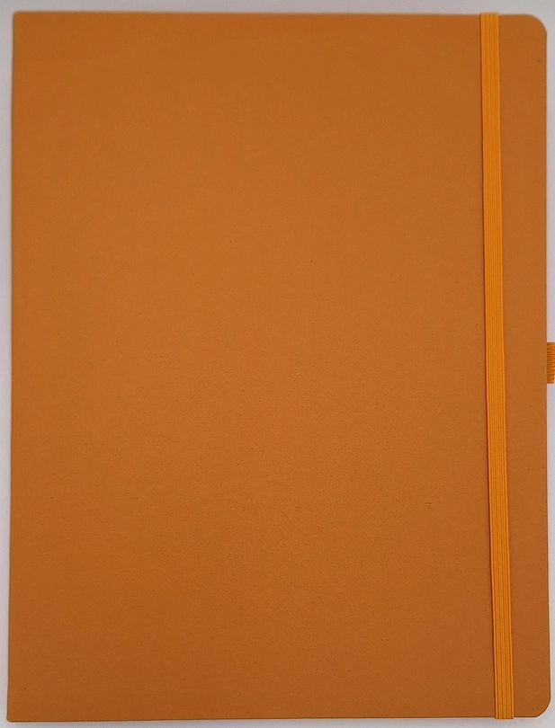 Ten notes wyprodukowaliśmy z jabłek. Giętka gładka oprawa z gumką zamykającą w kolorze beżowym (charakterystyczna dla linii Royal). Papier jabłkowy (biel lekko złamana écru), delikatny zadruk w kolorze bladozielonym.
