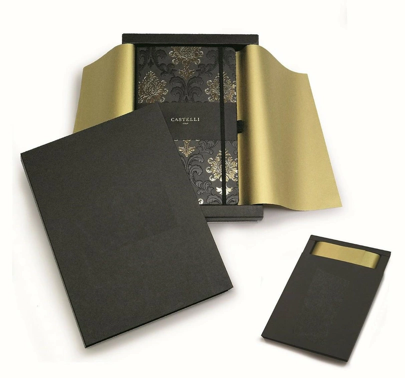 FORMAT: 132 x 212 mm PAPIER: karton WYKOŃCZENIE: Eleganckie czarne pudełko podarunkowe ze złotą bibułką (dostępne jako dodatkowa).Możliwość wtłoczenia logo na banderoli i/lub na opakowaniu.